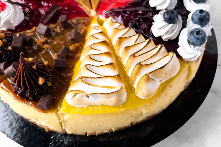 New York style cheesecake slice with graham cracker base topped with lemon curd, and finished with toasted meringue.