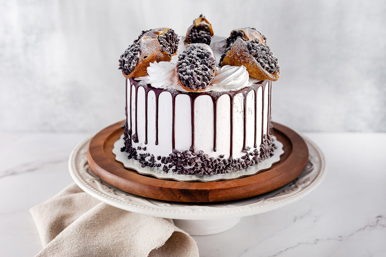 Moist vanilla sponge infused with freshly brewed espresso and filled with cannoli cream, cannoli shells, fudge, and chocolate chips. Topped with chocolate cannoli and whip rosettes. Sides covered in chocolate chips and chocolate drip.