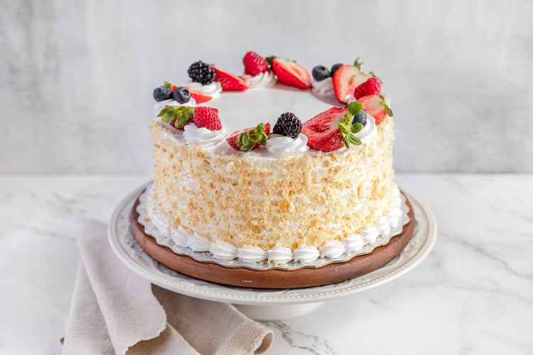 Three layers of flaky puff pastry layered with vanilla custard, fresh cut strawberries, blueberries, blackberries, and raspberries with a thin layer of strawberry filling.