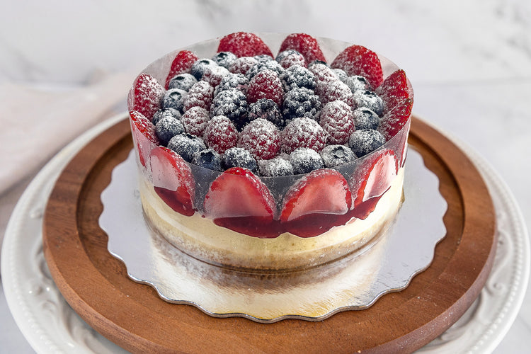 New York style cheesecake with graham cracker base, topped with raspberry filling and fresh berries assortment.