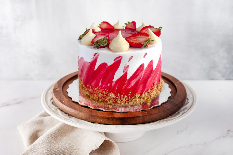 Vanilla sponge cake layered with cream cheese icing, graham crackers, chunks of cheesecake, and strawberry filling. Topped with strawberry filling, cream cheese dollops and fresh strawberry slices.