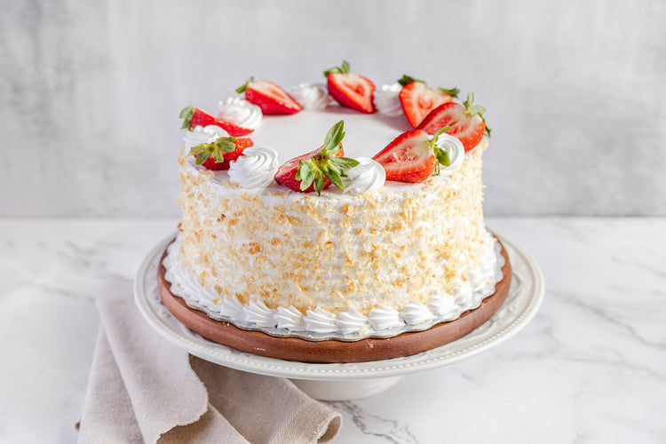 Three layers of flaky puff pastry layered with vanilla custard, fresh cut strawberries and a thin layer of strawberry filling.