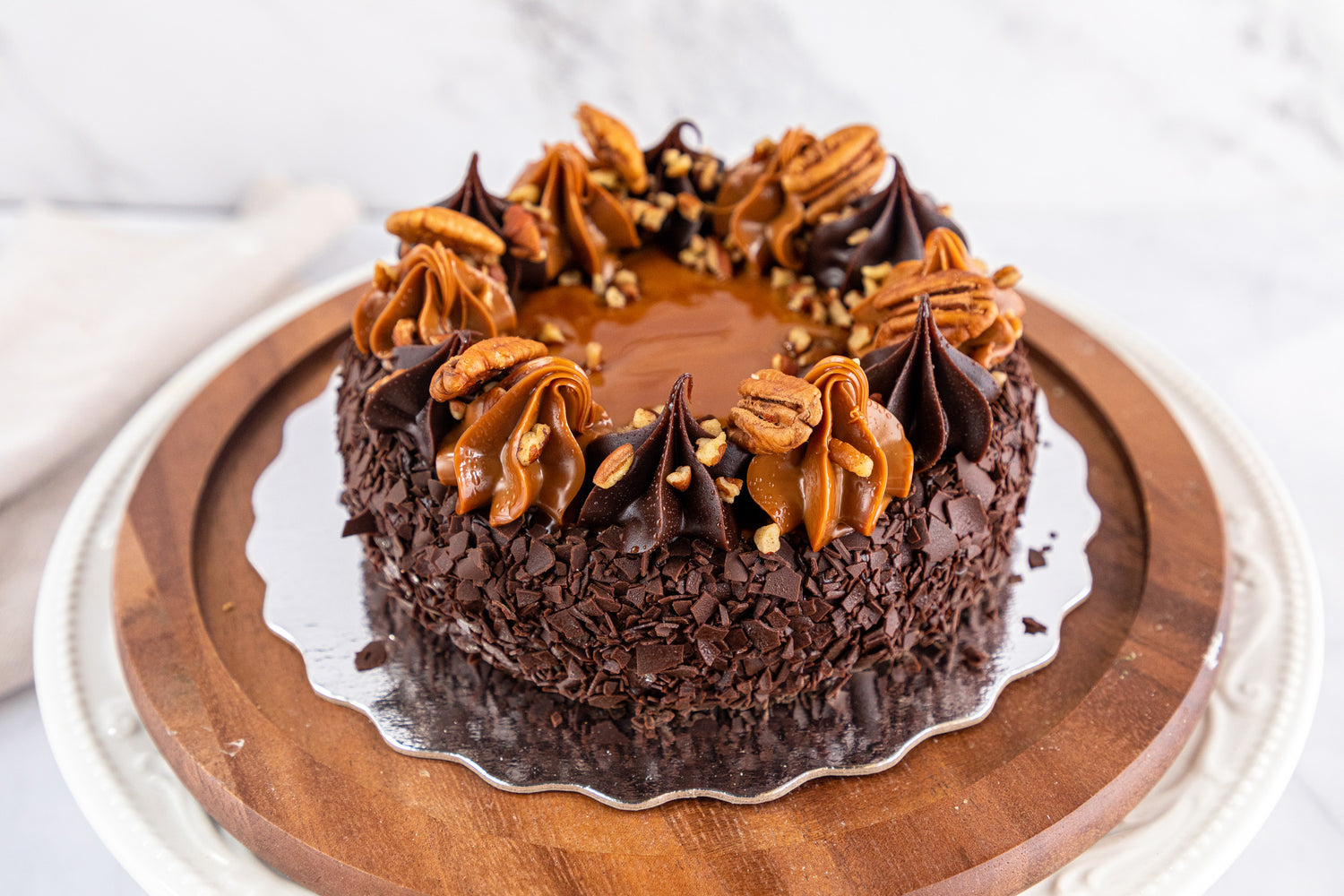 A pecan lovers dream in cheesecake form! New York style cheesecake with graham cracker base topped with caramel spread, trimmed with fudge & caramel rosettes, and finished with chopped pecan pieces. Chocolate shavings on the sides of the cheesecake.