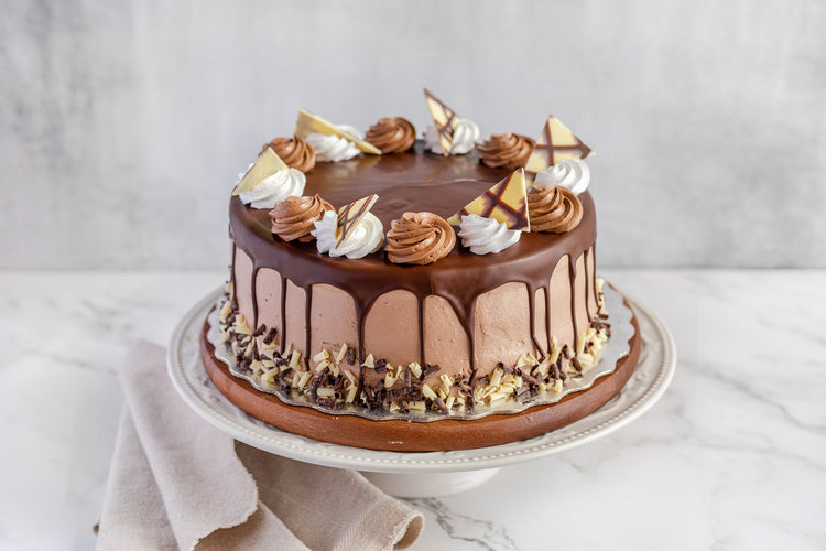 Three layers of flaky puff pastry layered with vanilla and chocolate custard, decorated with chocolate marble accents and chocolate whip.