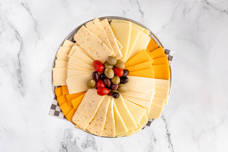 Fresh slices of the following cheeses: havarti, mild cheddar, mozzarella and jalapeno havarti. Garnished with an assortment of olives and cherry tomatoes.