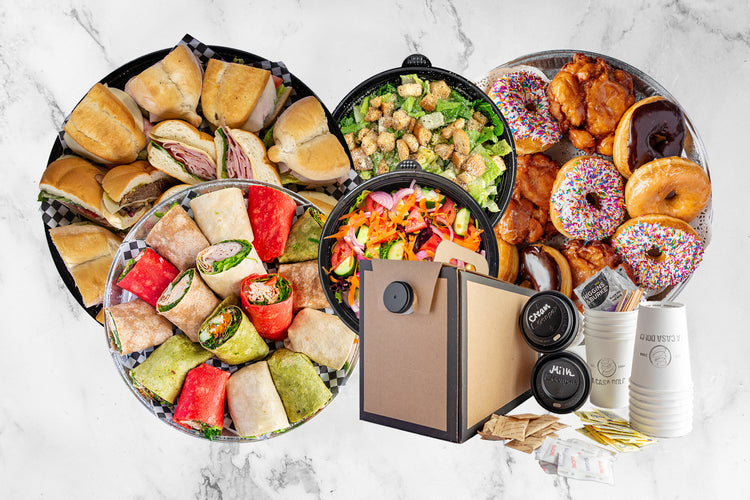 Our Joe-on-the-Go holds up to 10 cups of coffee and includes sugar, sweeteners, 2% milk, 10% cream, stir sticks, 10 medium cups and lids.