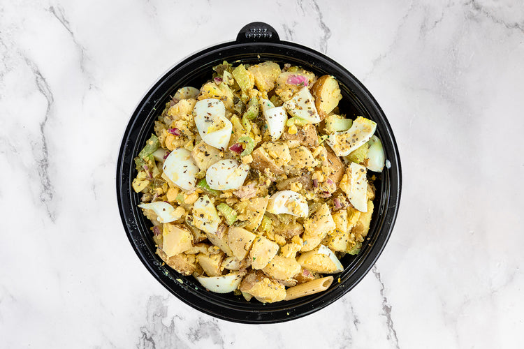 Boiled potatoes and eggs, red onions, celery, and sweet pickles, that is then finished with an in-house dressing.