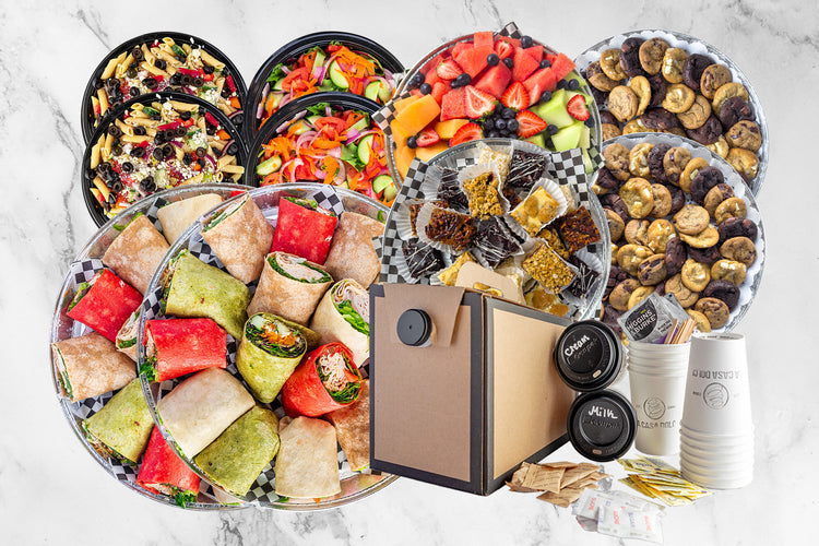 An assortment of 8 wraps cut in half for a total of 16 halves. Two of each of the following flavours: chipotle turkey, chicken, meat lovers and veggie.