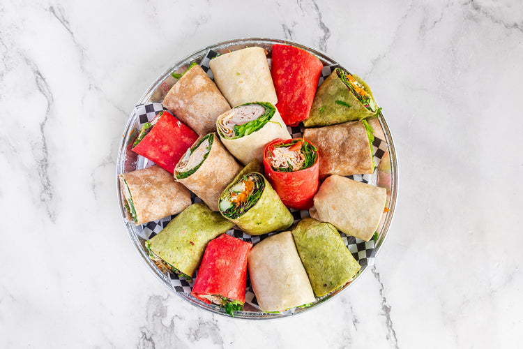 An assortment of 8 wraps cut in half for a total of 16 halves. Two of each of the following flavours: chipotle turkey, chicken, meat lovers and veggie.