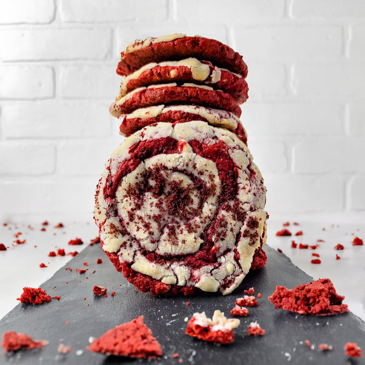 Classic red velvet cookie dough mixed with white chocolate chips, covered in cream cheese icing.