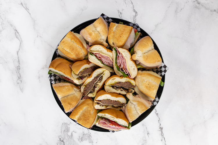 An assortment of 8 sandwiches cut in half for a total of 16 halves. Two of each of the following flavours: turkey, roast beef, ham & swiss, and Italian.