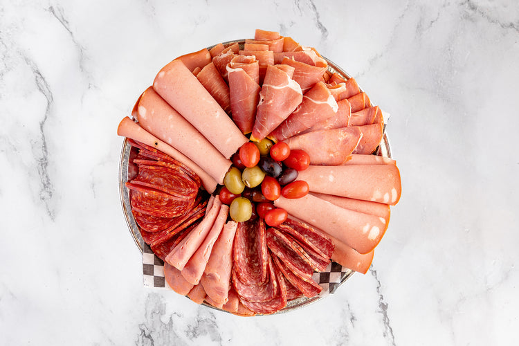 Fresh slices of the following meats: prosciutto, hot capocollo, mild capocollo, hot Genoa salami, mild Genoa salami, mortadella. Garnished with an assortment of olives and cherry tomatoes.