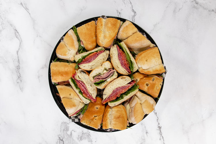 An assortment of 8 sandwiches cut in half for a total of 16 halves. Two of each of the following flavours: prosciutto, Florence, meat lovers and salami.