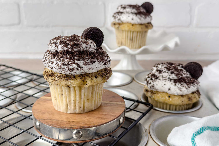 Oreo vanilla cake topped with cookies & cream buttercream, oreo chunks, and finished with a mini oreo.