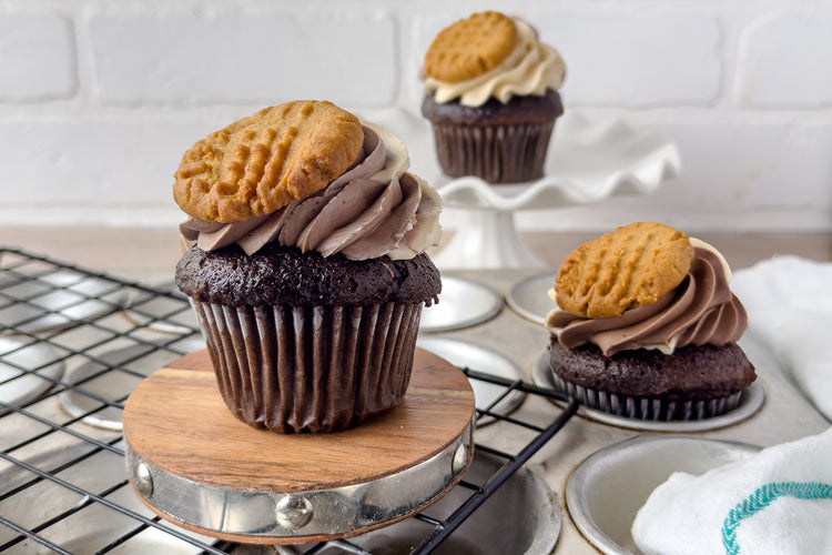 Chocolate cake filled with peanut butter, topped with chocolate peanut butter buttercream, and a mini peanut butter cookie.