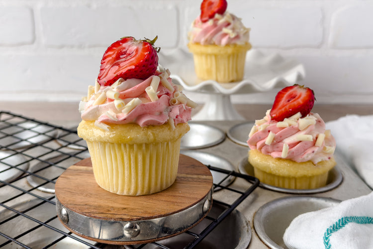 Vanilla cake with strawberry filling, topped with strawberry vanilla buttercream, and finished with white chocolate curls and slice of strawberry.