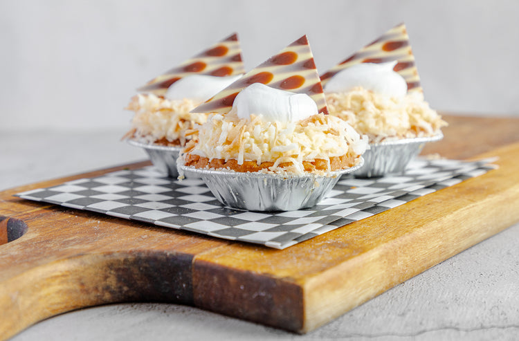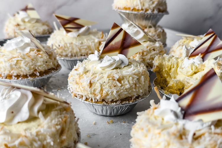Mini pie shell with coconut custard topped with toasted shredded coconut, a dollop of whip cream, and a marble chocolate fan.
