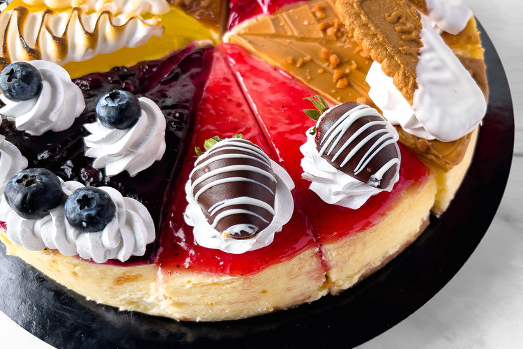 New York style cheesecake slice with graham cracker base topped with strawberry filling, a whip cream rosette, and fresh strawberry.