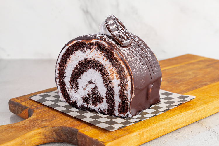 Chocolate: Chocolate cake sponge filled with whip cream and chocolate ganache, topped with whip cream and covered in chocolate ganache, finished with a chocolate leaf.