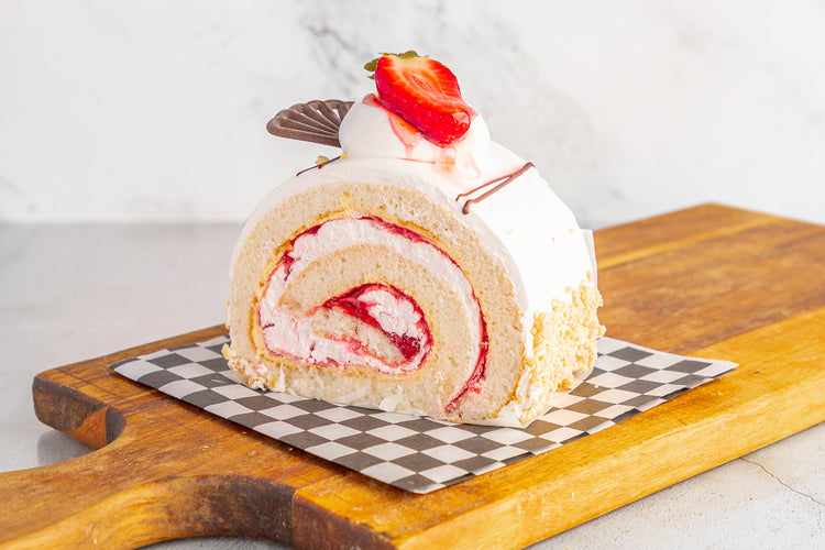 Strawberry: Vanilla cake sponge filled with custard, whip cream and strawberry filling, topped with whip cream, chocolate fan, and a sliced strawberry.