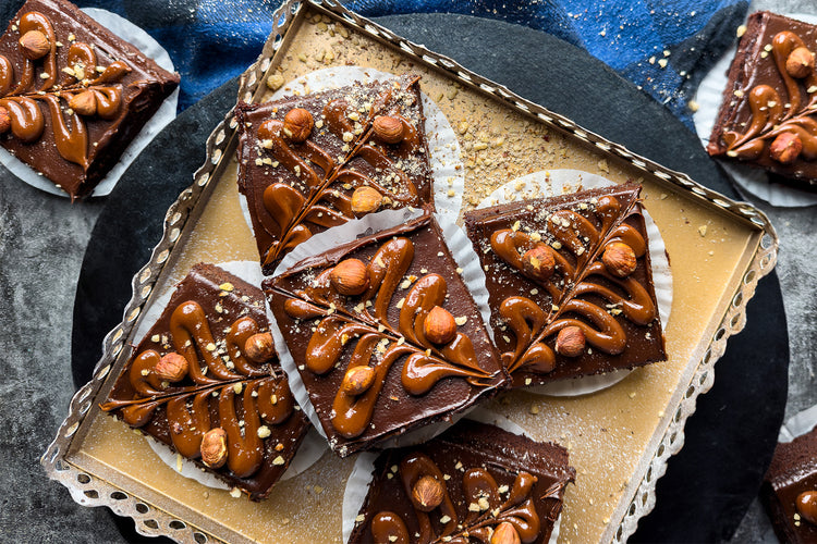 Brownie mix filled with nutella, topped with fudge icing, nutella swirl, crushed and whole hazelnuts.
