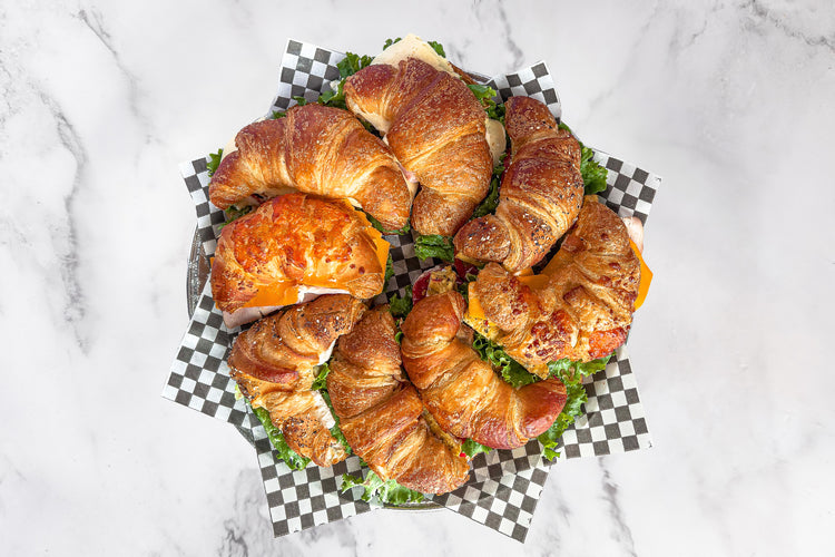 An assortment of croissant breakfast sandwiches that includes 2 of the following flavours: B.E.L.T., Classic, Deluxe & Greek.