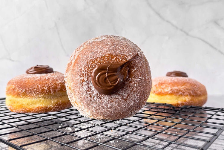 Yeast donut filled with nutella, dipped in sugar, and topped with a dollop of nutella.