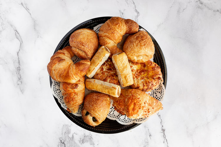 Looking for something less sweet for breakfast? Our savory breakfast platter is a great option. This platter includes: cheese croissants, sausage rolls, spinach feta croissant, plain croissants and egg n' bacon croissant.