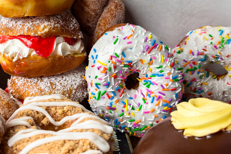 Yeast donut dipped in vanilla icing and rainbow sprinkles.