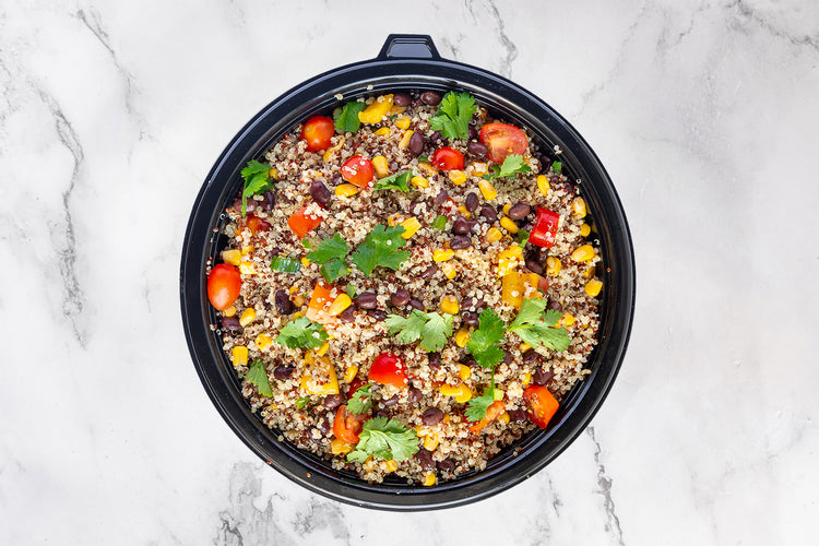 Cooked quinoa with bell peppers, black beans, corn niblets, green onion and cherry tomatoes finished with a lemon garlic dressing.