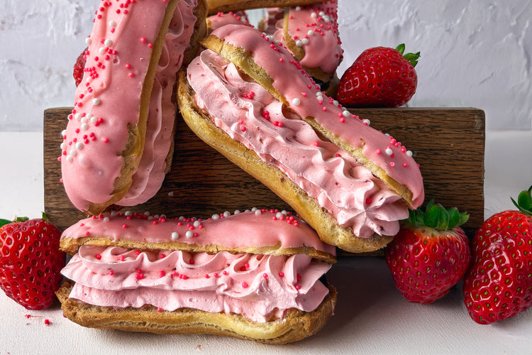 Choux pastry shell filled with Strawberry whip cream and strawberry pie filling. Dipped in pink chocolate and topped with little pink and white pearls.
