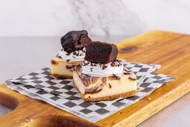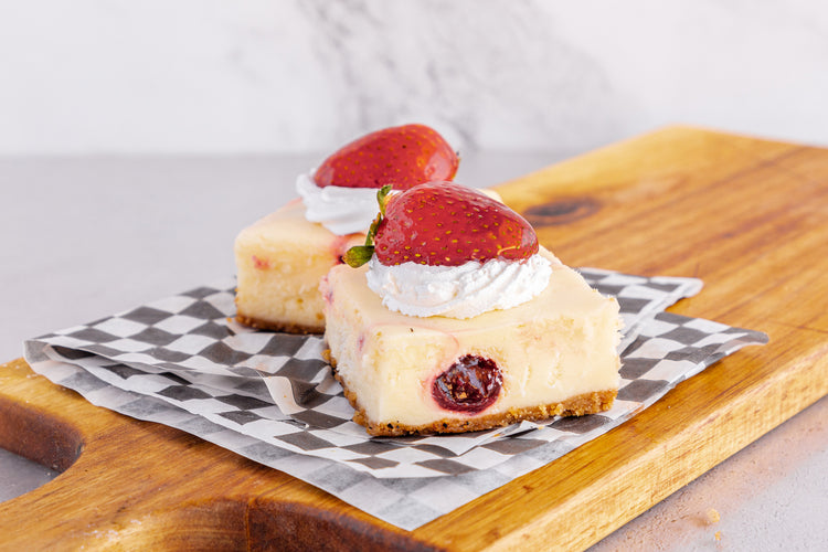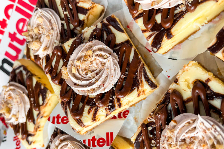 New York style cheesecake filled with either strawberry swirl topped with whip cream and a fresh strawberry, or fudge swirl topped with whipped cream and a fudge brownie, or nutella swirl topped with nutella whipped cream and crushed hazelnuts.