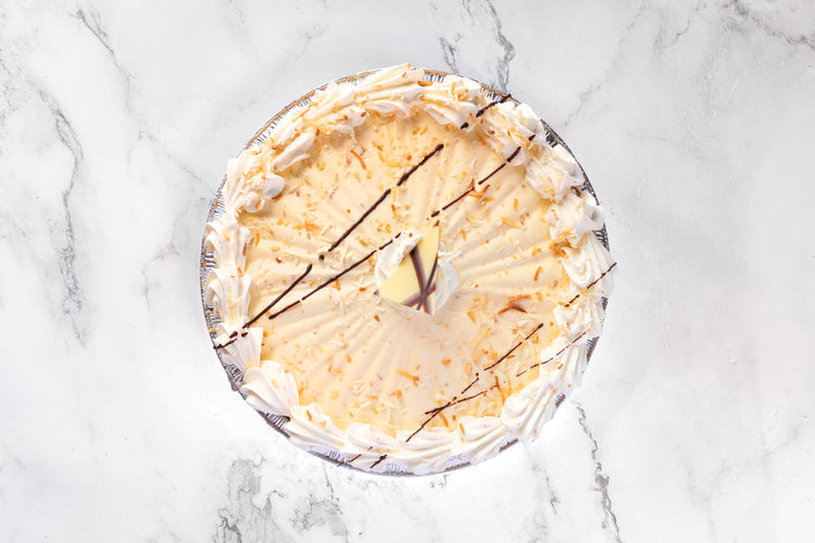 Graham cracker crust with coconut cream filling topped with whipped cream, chocolate drizzle, and a marble chocolate fan.