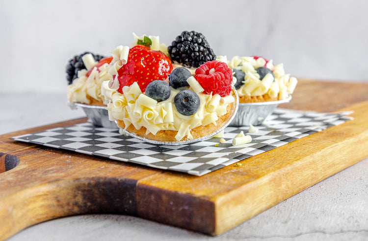 Mini pie shell filled with raspberry jam, vanilla custard, topped with fresh berries and white chocolate curls.