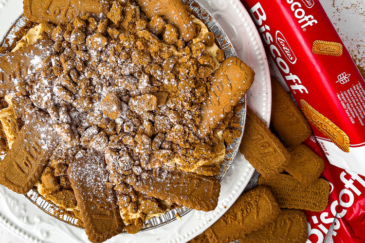 Biscoff Lotus cookie pie shell with custard, cookie butter and topped with Lotus Biscoff cookie crumble and cookies.